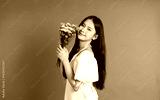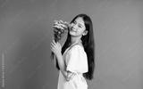 Portrait of a cheerful young woman holding a bouquet of flowers against a solid blue backdrop
