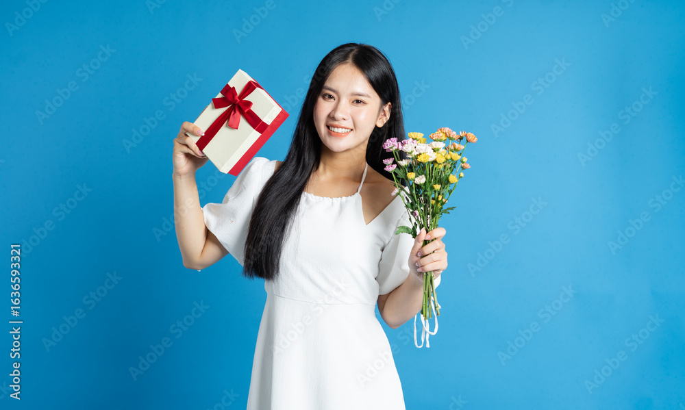 Young woman with a gift and flowers against a blue backdrop celebrating a special occasion