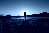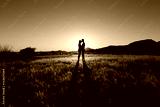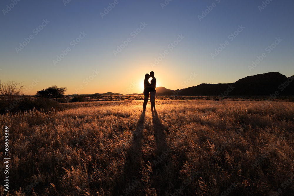 Couple kissing at african savanna landscape. Namibia, South of Africa.
