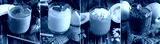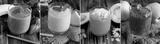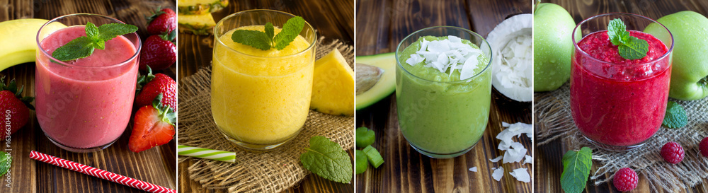 Collage of smoothie with fruits and berries in the drinking glasses on a wooden background. Close-up.