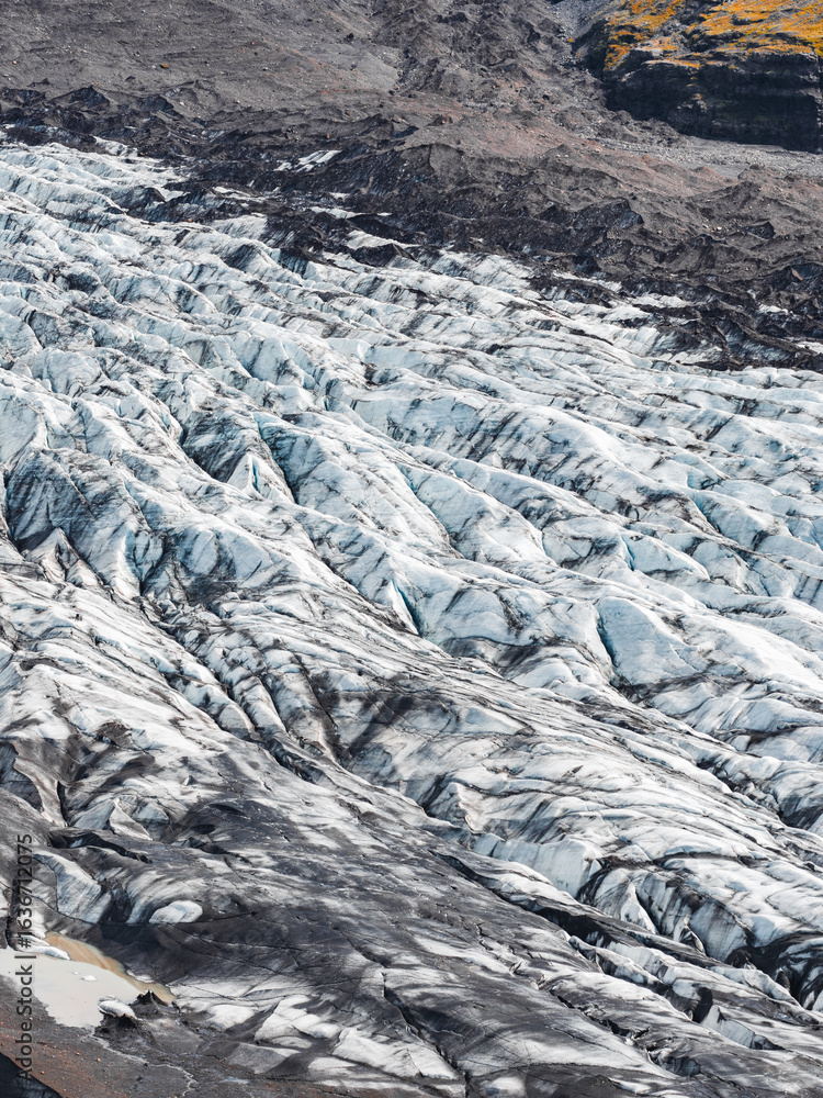 A glacier in Iceland displays intricate ice patterns with dark volcanic ash streaks, surrounded by rocky terrain and a patch of yellow vegetation.