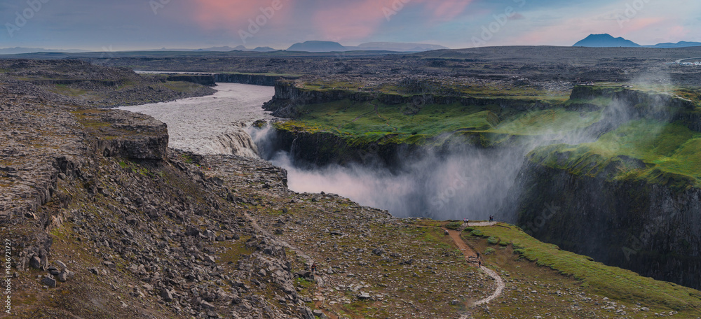 Dettifoss waterfall plunges into a deep canyon with mist rising, surrounded by rocky terrain, green moss, and a pink and blue sky in Iceland.
