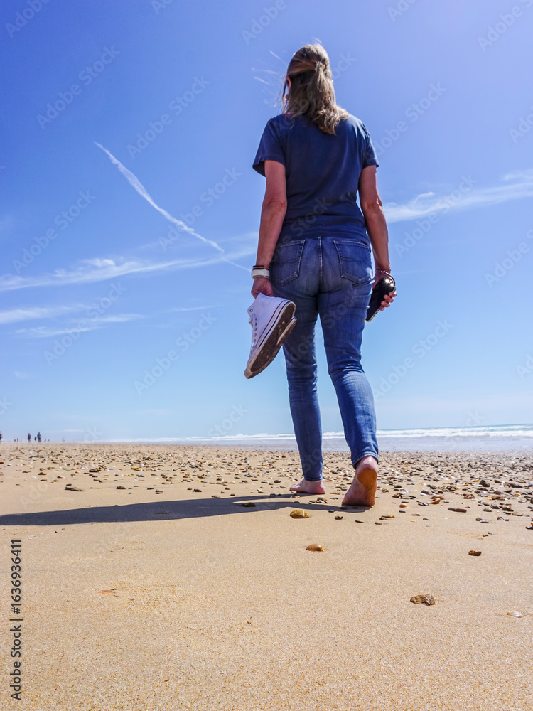 A barefoot woman walks along the shore of a long golden sand beach with the blue sea in the background