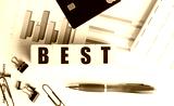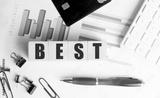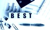 Wooden blocks with word best on desk with charts, pen, calculator, credit card and office supplies