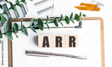 Wooden blocks with letters arr on clipboard with charts, pen and green plant
