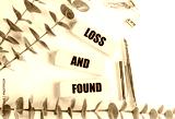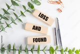 Wooden blocks with words loss and found on white desk with green plant, pens, paper clips and push pins