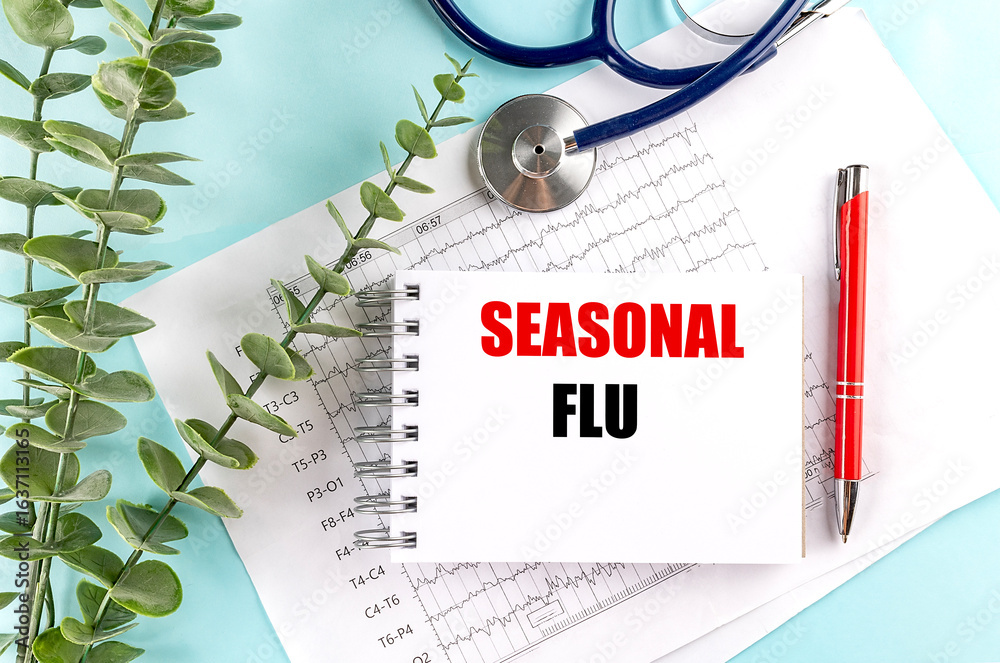 Notepad with text seasonal flu on medical documents with stethoscope, red pen and green plant