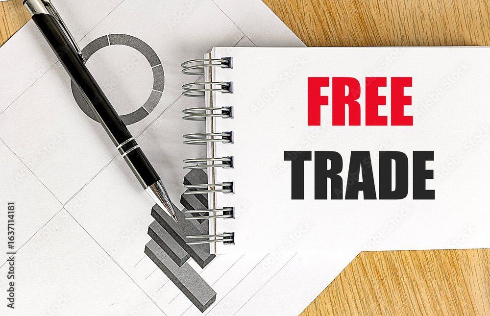 Notepad with text free trade on wooden desk with pen and business charts