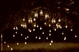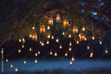 Night wedding ceremony with a lot of vintage lamps and candles on big tree