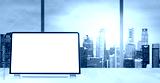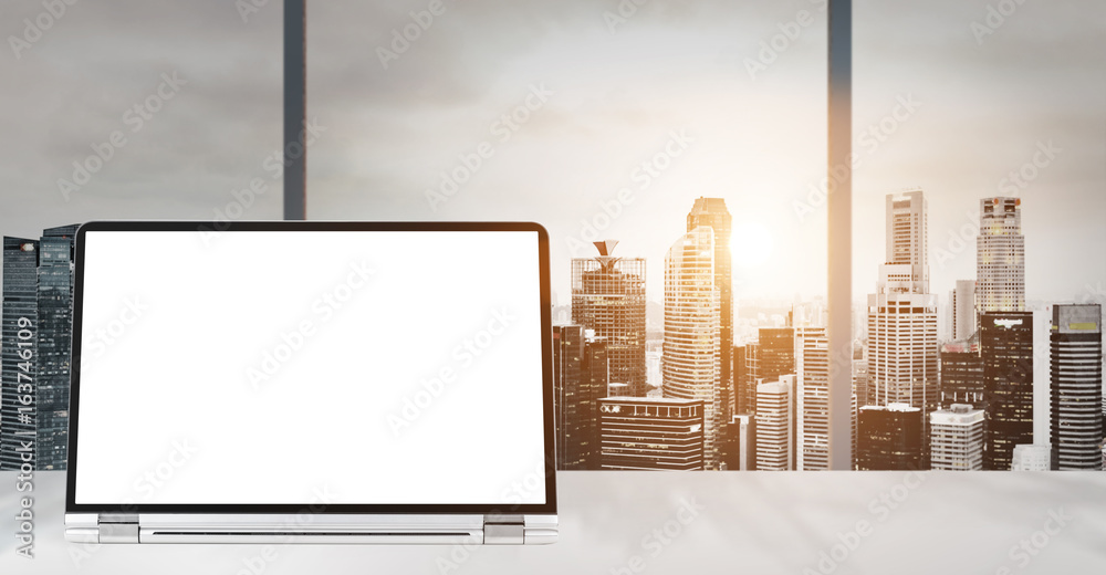 Laptop on table in office with panoramic sunset view of modern downtown skyscrapers at business district, blank screen