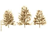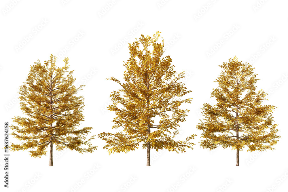 Three autumn trees with beautiful golden leaves stand in a row against a white background, perfect for use in a variety of design projects.