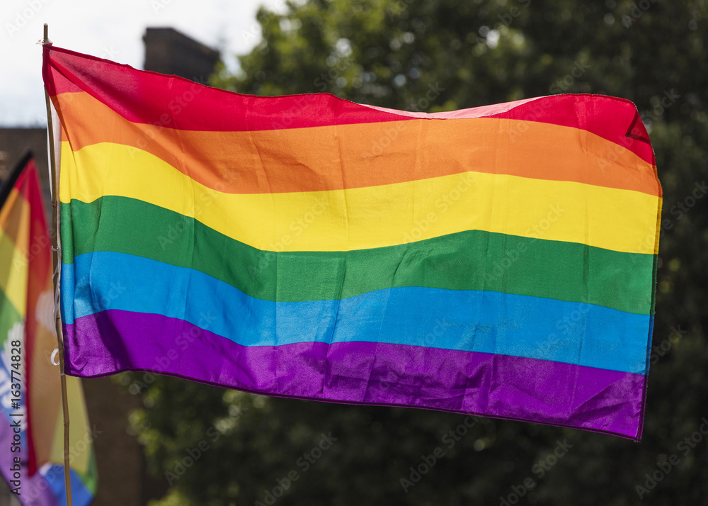 Gay rainbow flag being waved at an LGBT gay pride march in London