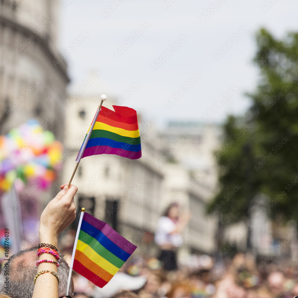 A spectator waves a gay rainbow flag at an LGBT gay pride march in London
