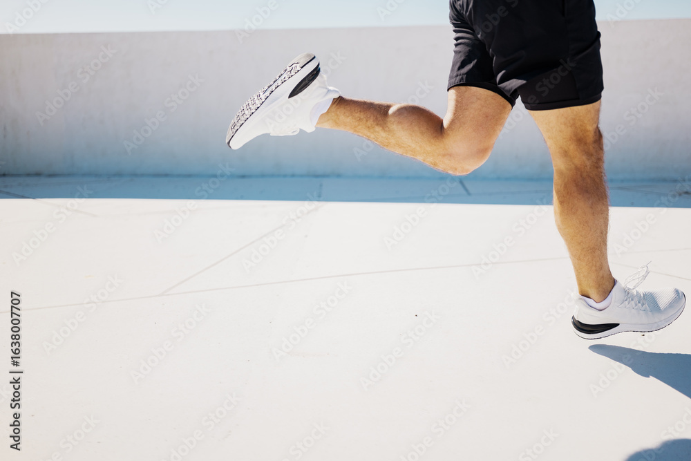 Running on a sunny rooftop, a man enjoys fitness and freedom while training for a healthier lifestyle