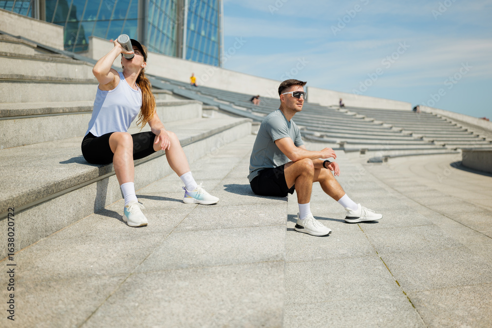 Relaxing on the steps, a couple enjoys a sunny day while sipping drinks and taking a break from their workout routine