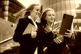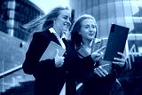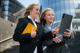 Two women in professional attire engaging with a tablet outdoors near modern architecture
