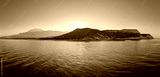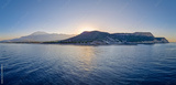 Seaside panoramic view of Kiris resort near Kemer, Turkey, with sunset over the majestic Taurus mountain and the deep blue Mediterranean Sea