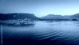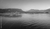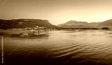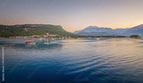 Seascape sunset panorama over the Mediterranean Sea near Kemer, Turkey. Panoramic view to the moonlight beach at dusk and a lone boat cruises across the calm water towards the majestic mountains