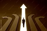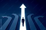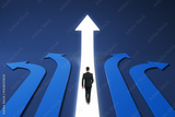 Businessman walking into glowing upward arrow among blue arrows on dark background symbolizing leadership, success, and career direction.