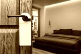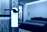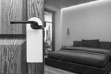Blank door hanger tag on wooden handle of an opened hotel room door with modern bedroom interior and city skyline view in background at dusk. 3D Rendering