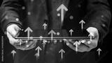 Businessman holding tablet with glowing upward arrows symbolizing growth, innovation, and virtual progress in a digital environment.