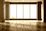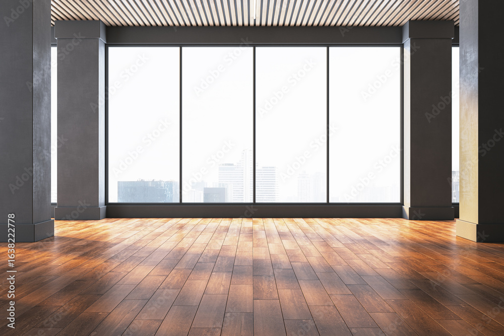 Modern empty office interior with large windows, wooden floor, city skyline view, and natural sunlight creating shadows on the walls and floor. 3D Rendering