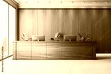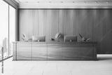 Modern wooden office reception desk with computers and plants in bright corporate lobby interior with city view and minimalist business design. 3D Rendering