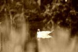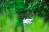 A Black-headed Gull rests calmly on the surface of a lake, surrounded by lush green foliage. The bird's reflection ripples gently in the tranquil water, in the late afternoon