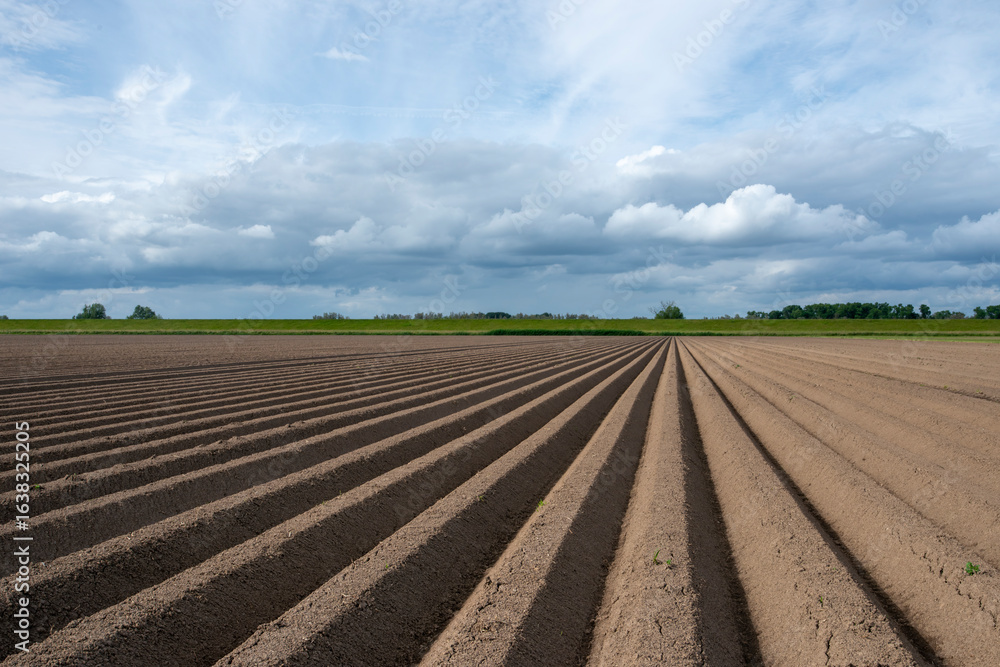 Freshly plowed farmland with long parallel furrows under a dramatic cloudy sky and bright green horizon in a rural agricultural landscape