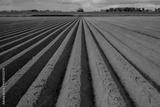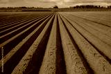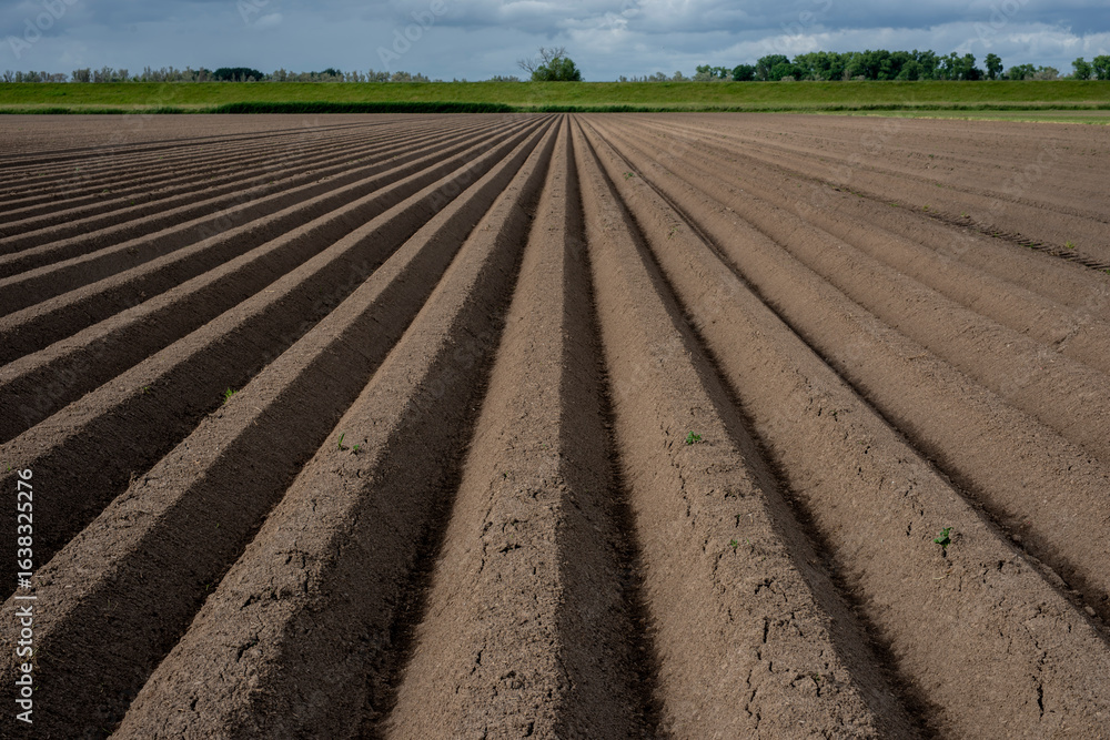 Freshly plowed agricultural field with deep parallel furrows leading toward a green horizon under a partly cloudy sky in a rural farming landscape