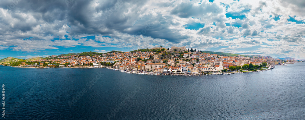 Sibenik old town panorama with St Michaels Fortress above Adriatic port under summer clouds Croatia