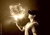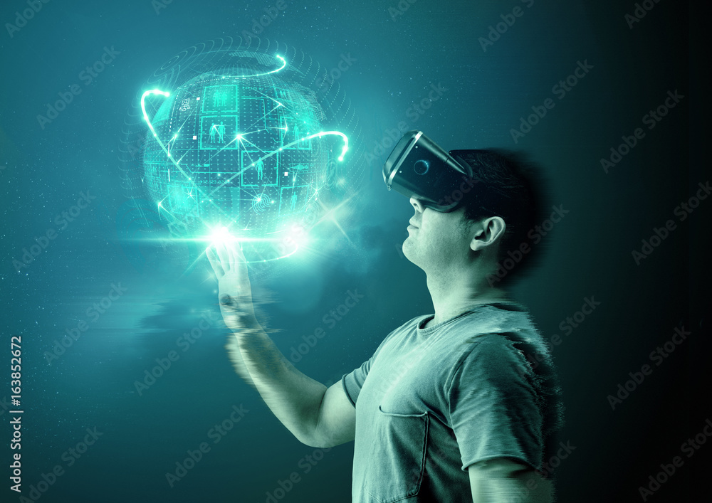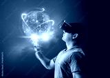 A man wearing virtual reality (VR) goggles and headset with a projection of a digital world.