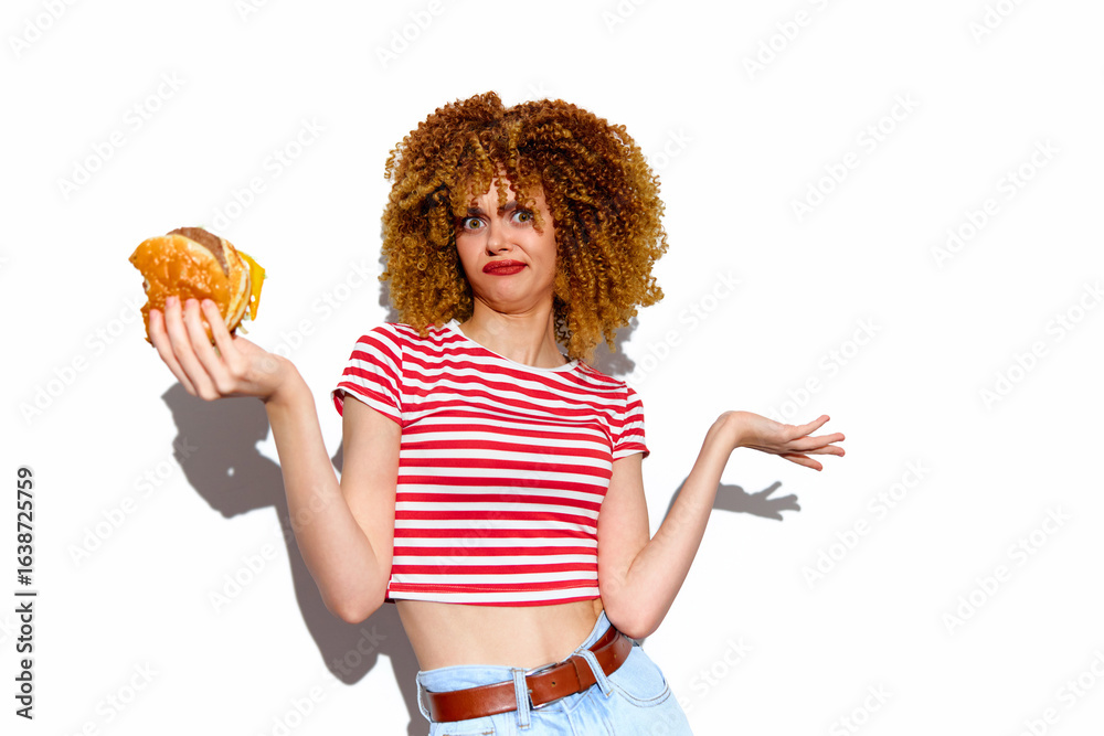 Cheerful young woman with curly hair holding a burger and expressing indecision, wearing a striped shirt against a bright white background, representing dietary choices