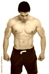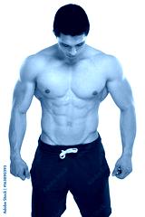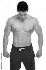 Bodybuilder Bodybuilding Muskeln Bauchmuskeln Sixpack Abs Mann stark muskulös schaut nach unten Freisteller