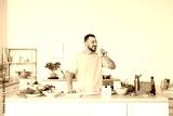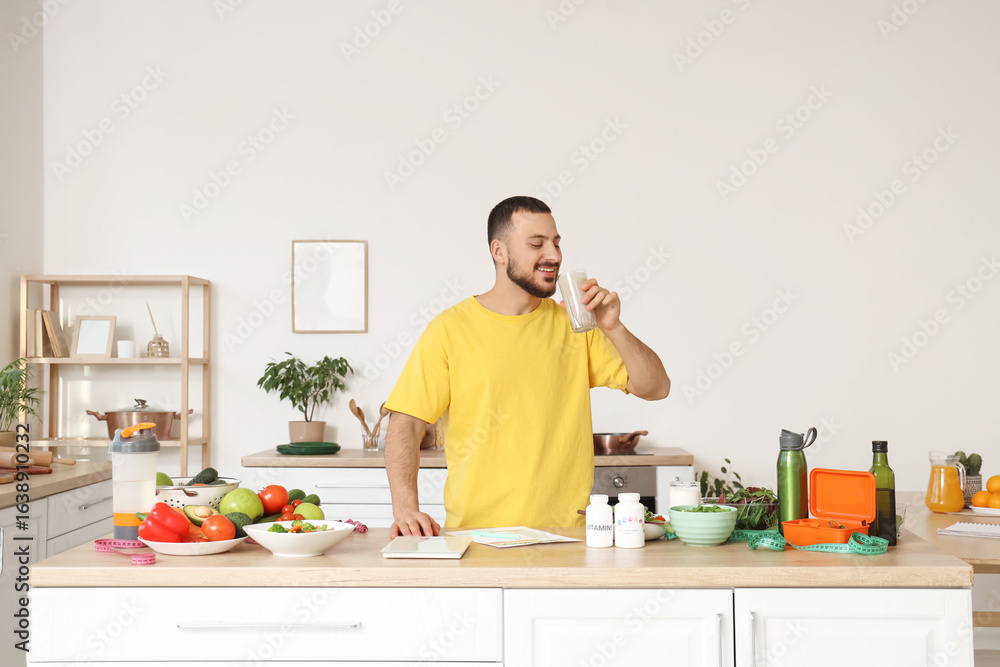 Handsome young man with fresh vegetables drinking healthy smoothie in kitchen. Healthy food concept