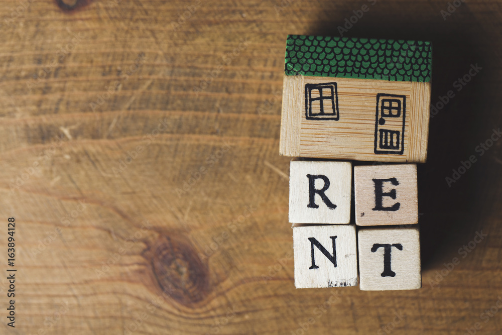 Home rent concept. House model with rent word made from wooden blocks.
