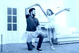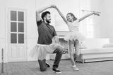 multicultural father and daughter in pink tutu tulle skirts dancing at home