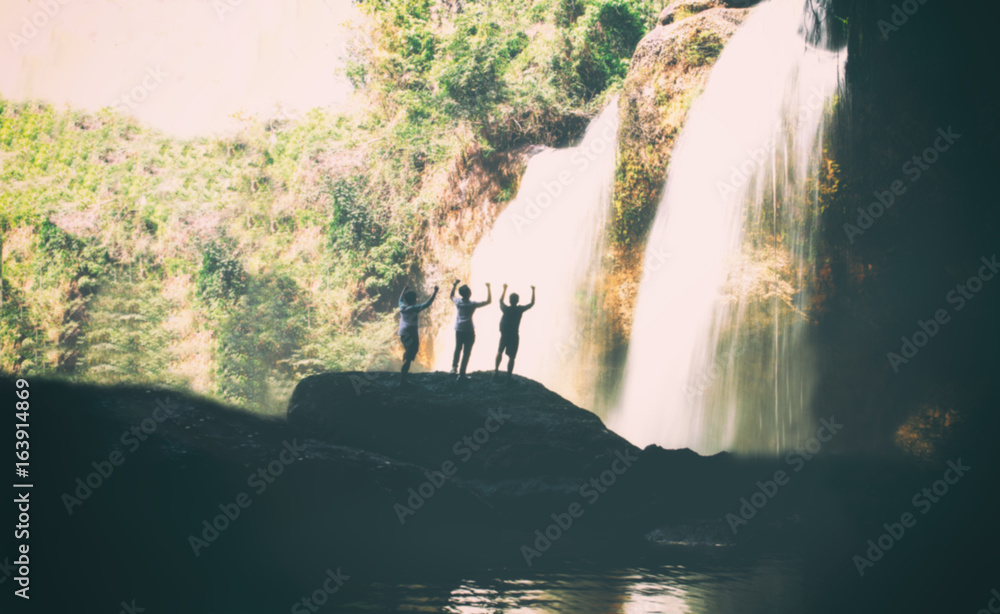 Blurry of traveler standing at waterfall in deep forest at Khao Yai National Park, Thailand