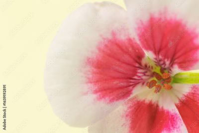 Macro view of a white and pink geranium flower. All on a yellow background. Horizontal.