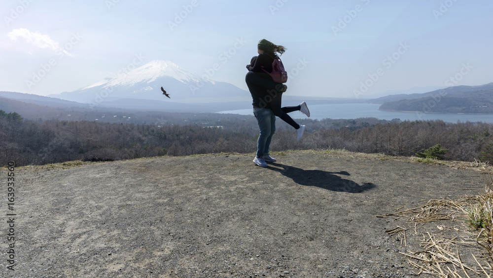 happy young couple in romance on summer beautiful Mt. Fuji ,Fujisan Japan.