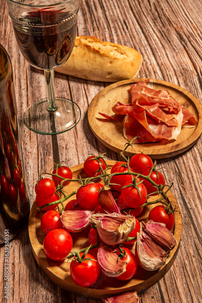 Sunset in the kitchen: ripe tomatoes, slivered ham, and oil forming waves on a handmade ceramic plate
