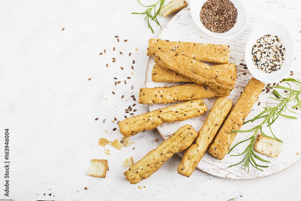 Bread sticks from puff pastry with flax and sesame seeds on a light background with rosemary. Top View.