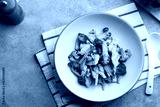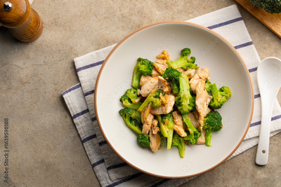 Stir Fried sliced Broccoli with chicken breast in oyster sauce.Thai food.Top view.