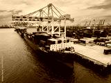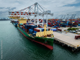commercial port load and unloading cargo from container ship for import export by crane for distributing goods by trailers transported to customers and dealers,