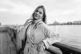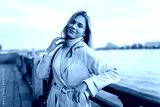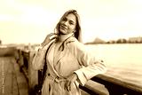 Portrait of young woman in elegant coat posing on embankment in sun rays. Beautiful woman enjoying sunset near river. Beauty, style and walks concept.