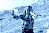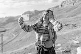 Female hiker with colorful backpack takes selfie against backdrop of picturesque mountain landscape. Hiker woman blogs and enjoys her sunset adventure in the mountains. Blogging, nature concept.