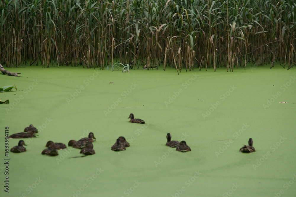 Stockenten auf einem Teich mit Entenflott (kleien Wasserlinse - Anas platyrhynchos - Lemna minor 2