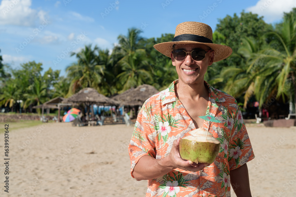 Hispanic Male Tourist in Panama Hat and Tropical Shirt Summer Vacation at Beach Holding Coconut