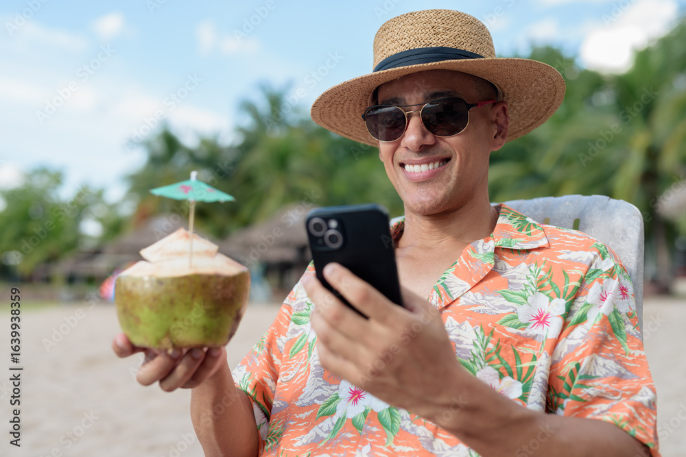 Hispanic man tourist sitting and using phone while having coconut water drink