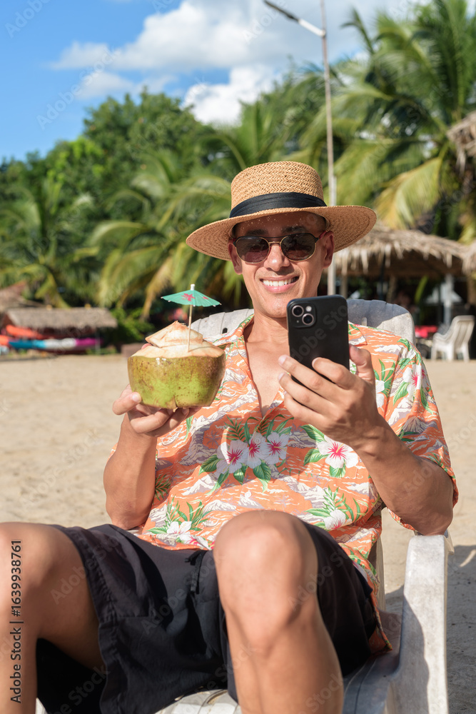 Hispanic man tourist sitting and using phone while having coconut water drink